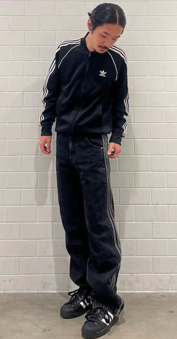 変わり種「デニムトラックパンツ」で差をつける 定番のジャージ素材ではなく、デニム素材のアディダストラックパンツをチョイス。スポーティーさとカジュアルさが絶妙に融合し、周りと一歩差がつく個性的なスタイルに仕上がります。