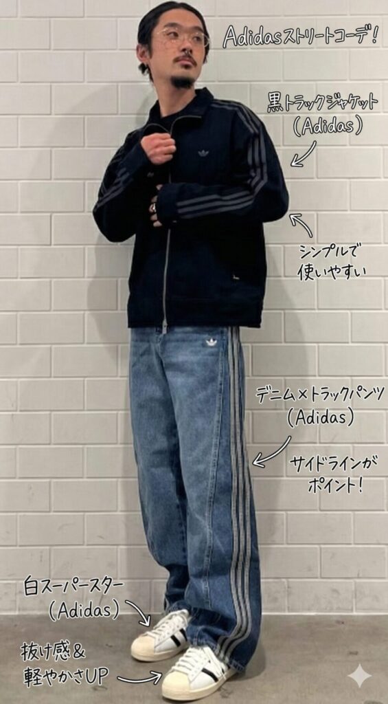 一言で言うと: 「デニム素材のトラックパンツを主役に、白スニーカーで抜け感を出した技ありアディダスコーデ」です!