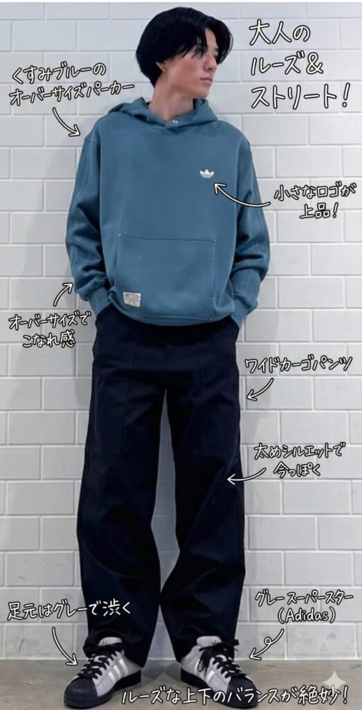 一言で言うと: 「オーバーサイズなくすみブルーのパーカーとワイドなカーゴパンツで、大人の余裕を感じさせるルーズなストリートスタイル」です!