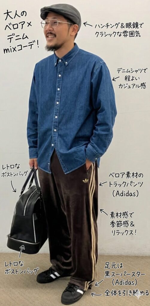 「デニムシャツ × ベロアパンツ」の絶妙なハズしテク きちんとした印象のボタンダウンデニムシャツに、あえてリラックス感のあるアディダスのベロアトラックパンツを投入。この意外な組み合わせが、大人の余裕を感じさせる「こなれ感」を生み出しています。