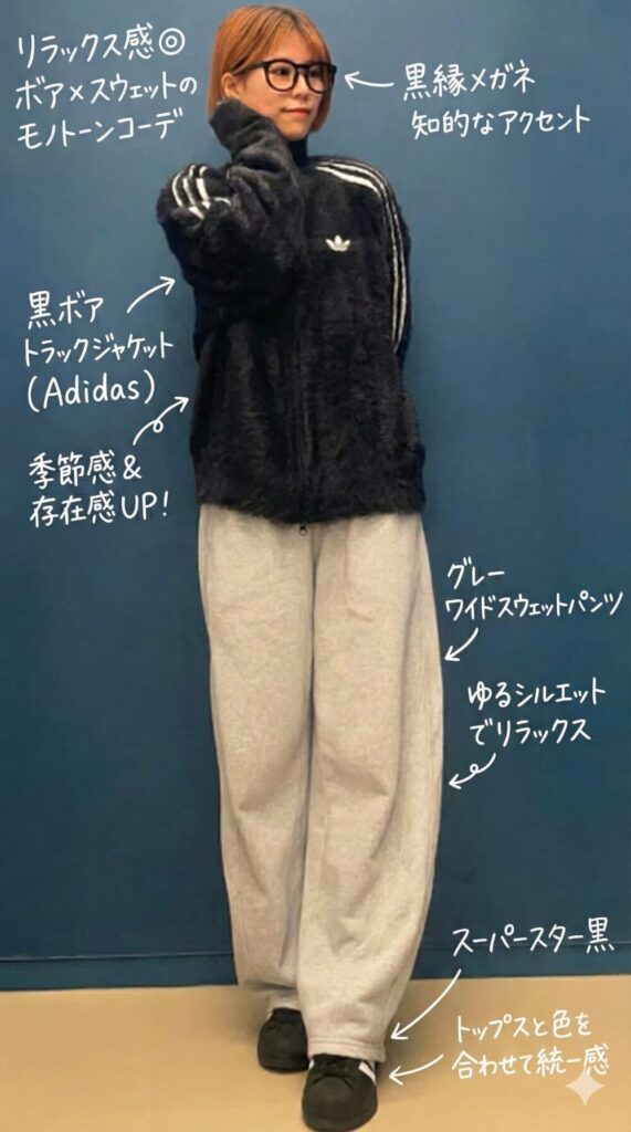 - トップスに黒のボア素材、ボトムスにグレーのスウェット素材を合わせることで、モノトーンでありながら素材感のコントラストが際立ち、季節感のある着こなしになっています。