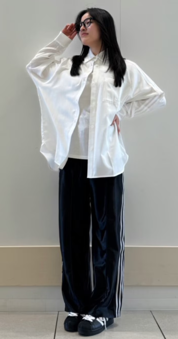 - 足元の黒スニーカー(Adidas)でトップスと色をリンクさせて全体を引き締めつつ、顔周りの黒縁メガネが知的なアクセントとなり、部屋着っぽくなるのを防いでいます。