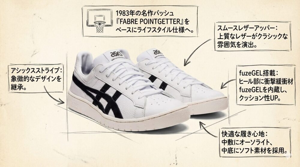細かく言うと、山王高校が着用しているのは「ファブレポイントゲッター」というバッシュで生産は終了していますが、その復刻モデルがこのGELーPTGになっております。