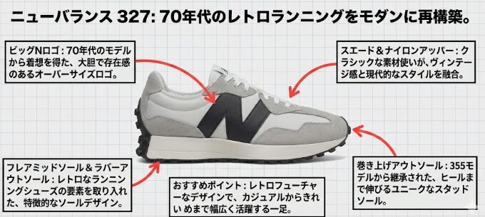 ニューバランス327は、1970年代のランニングシューズをベースに現代的なアレンジを加えた一足として誕生しました。