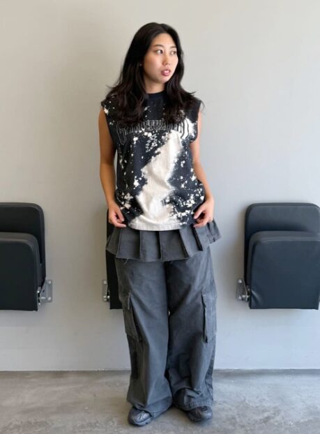 トップスはオーバーサイズのTシャツやパーカーを合わせれば、今どきのストリートスタイルの完成です。