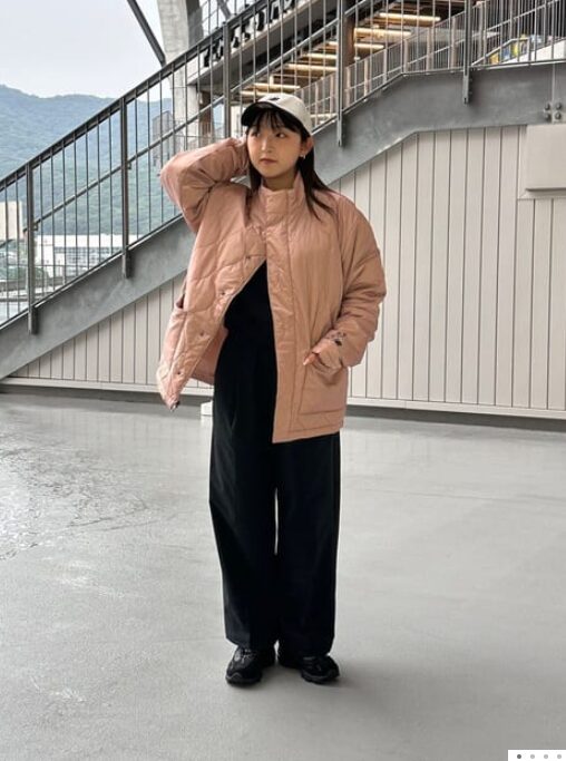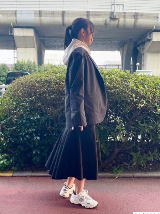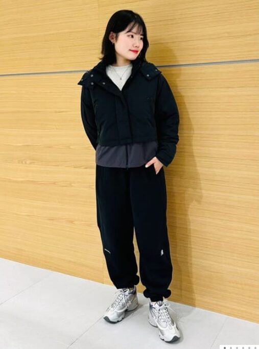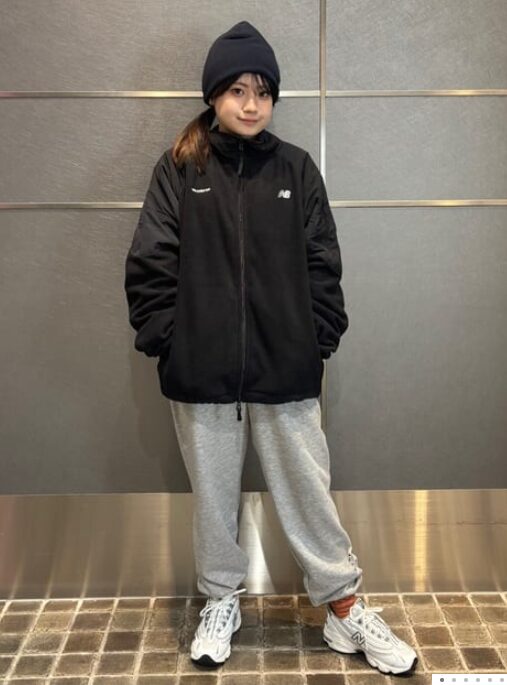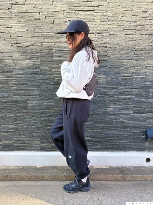部屋着っぽくならないコツは、「ソックスをチラ見せで足元をすっきりさせる」か、「短め丈のトップスでお腹をチラ見せする」など、シルエットにメリハリをつけることです。M1000のボリューム感がアクセントになります。