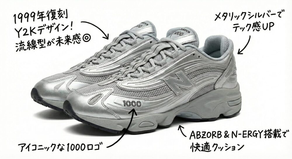 M1000はもともと1999年に発売されたモデルです。当時はあまり目立たなかった存在かもしれませんが、Y2K(2000年代)ファッションがトレンドの今、この「ちょっと懐かしいけど新しい(レトロフューチャー)」な雰囲気がドンピシャで刺さっています。